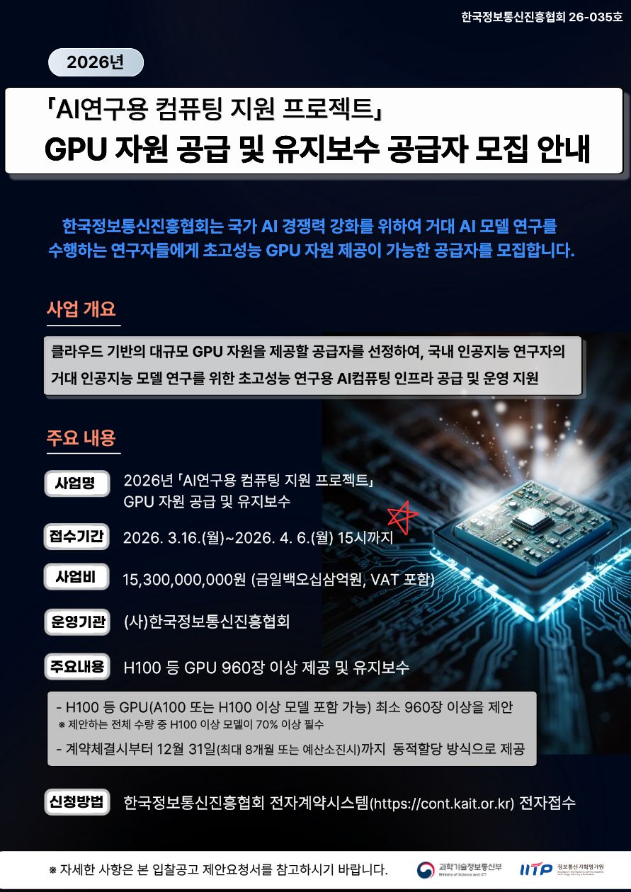 「2026년 AI연구용 컴퓨팅 지원 프로젝트」 GPU 공급자 모집 안내